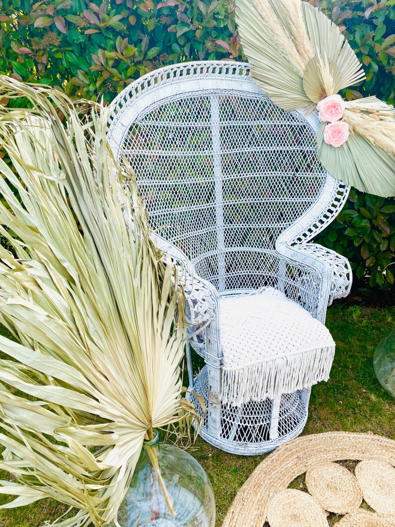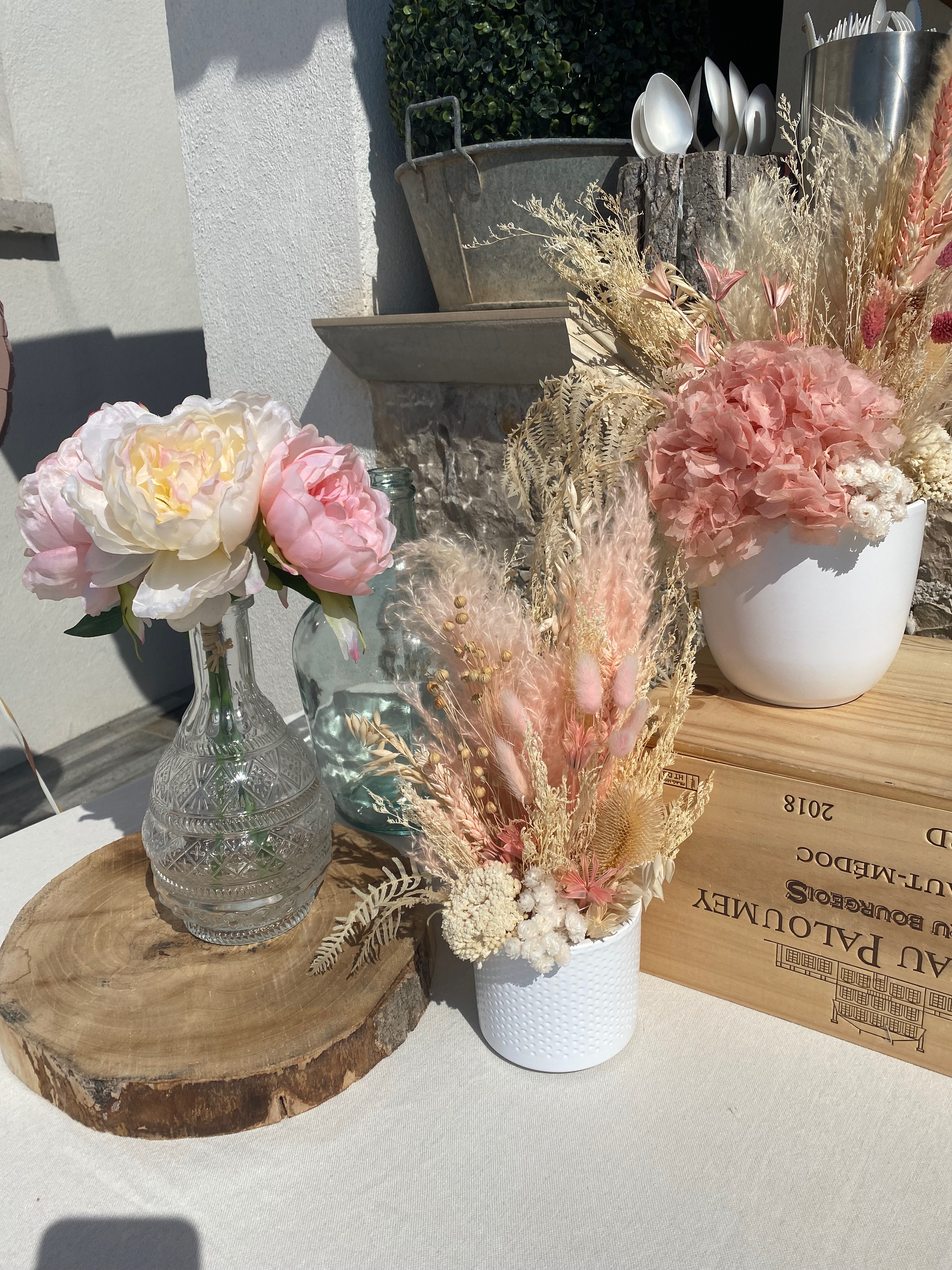 Retour en images sur la décoration Bohème dans les tons pastels réalisée pour le baptême de Léa. Arche et décoration de buffet en fleurs séchées…