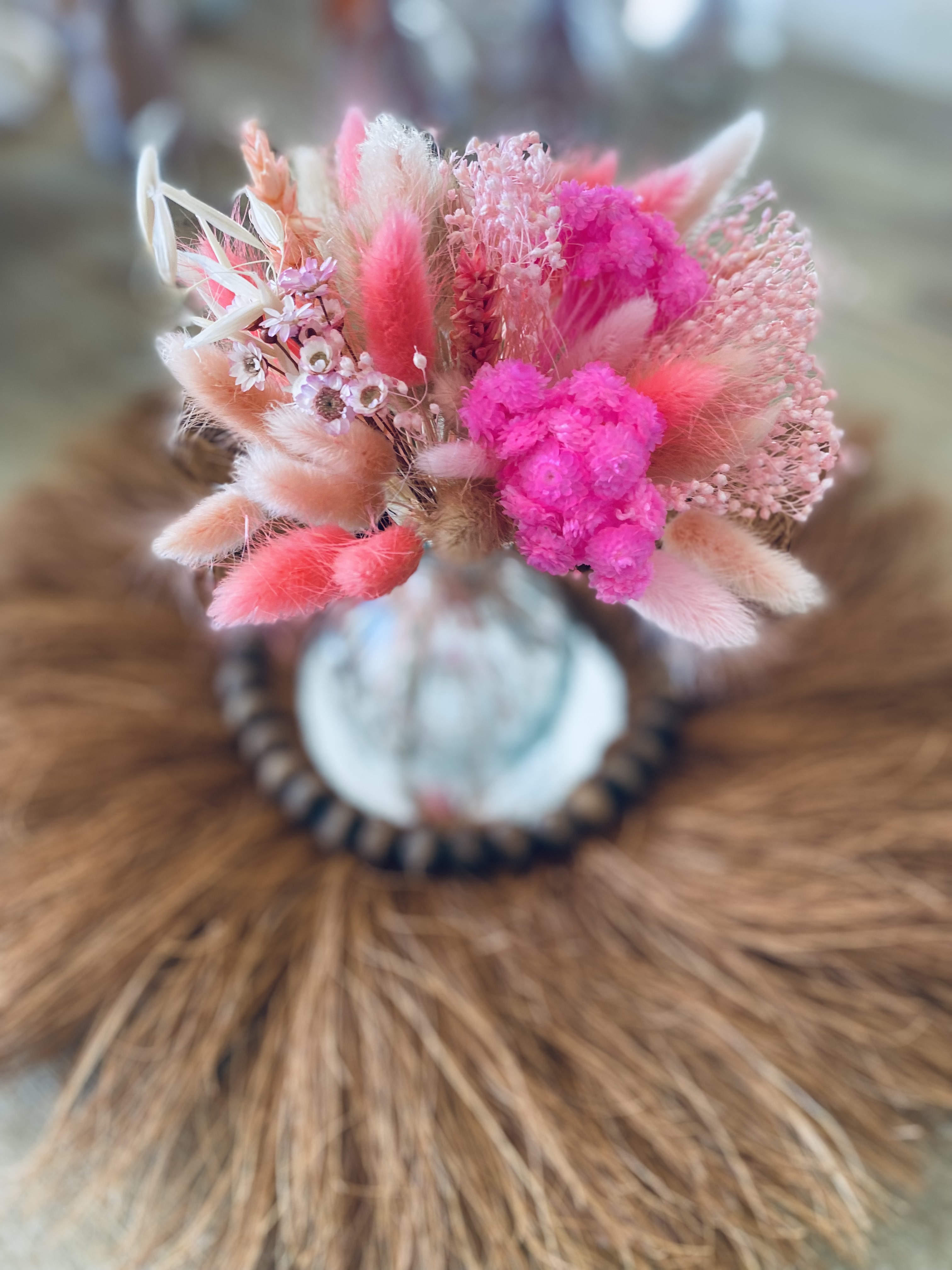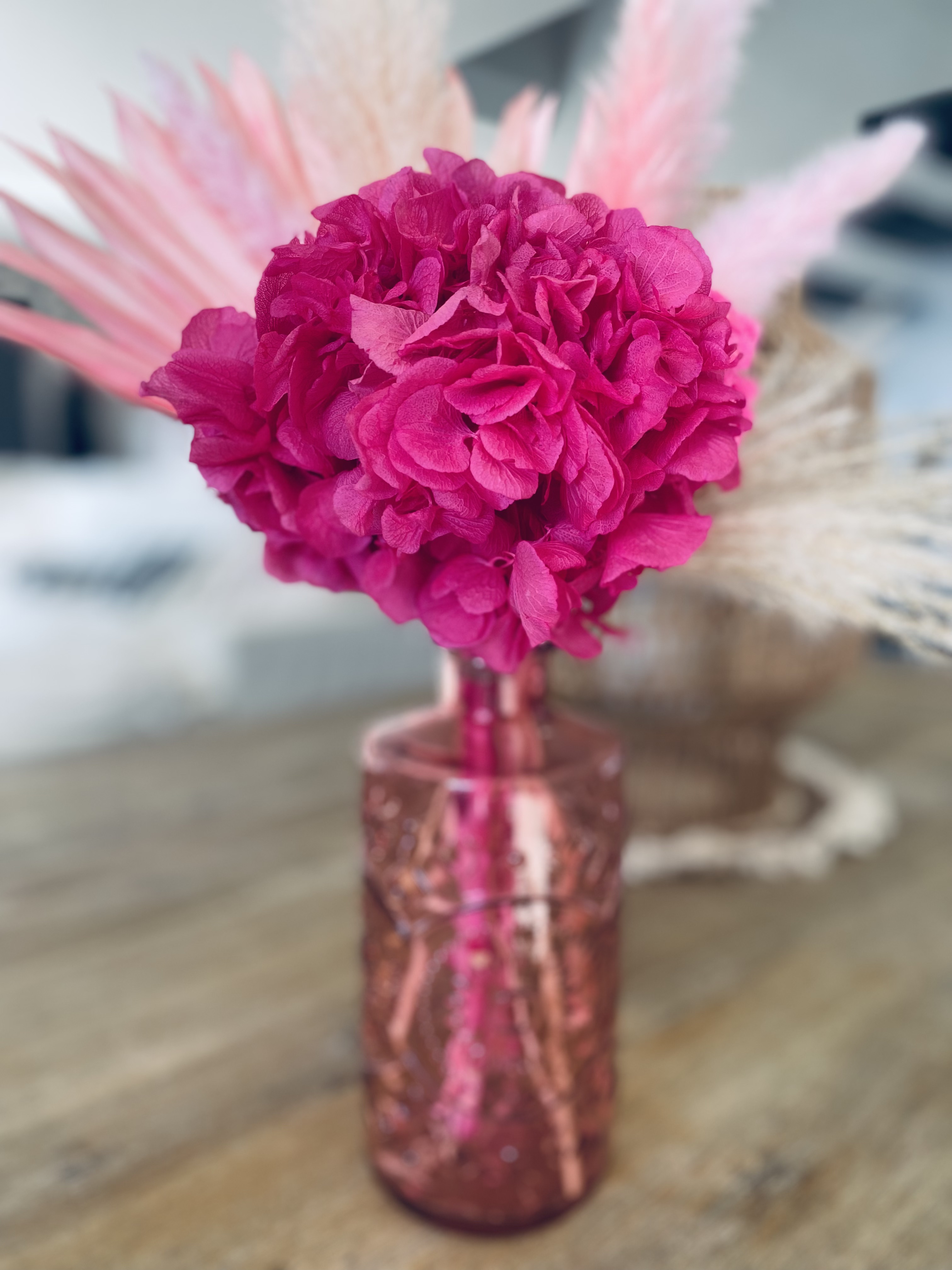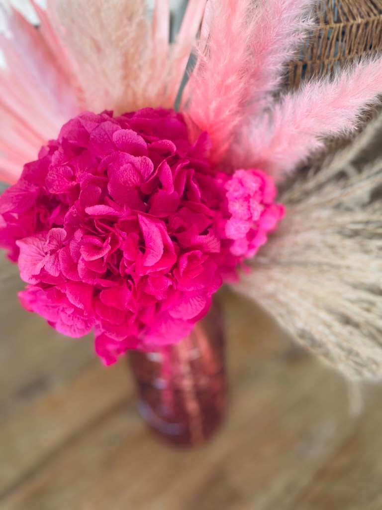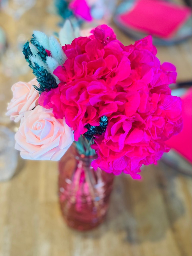 Retour en images sur une décoration de table réalisée pour un anniversaire dans les tons flashy fuchsia et turquoise. Centre de table en hortensia stabilisé et fleurs séchées. Des magnifiques couleurs!