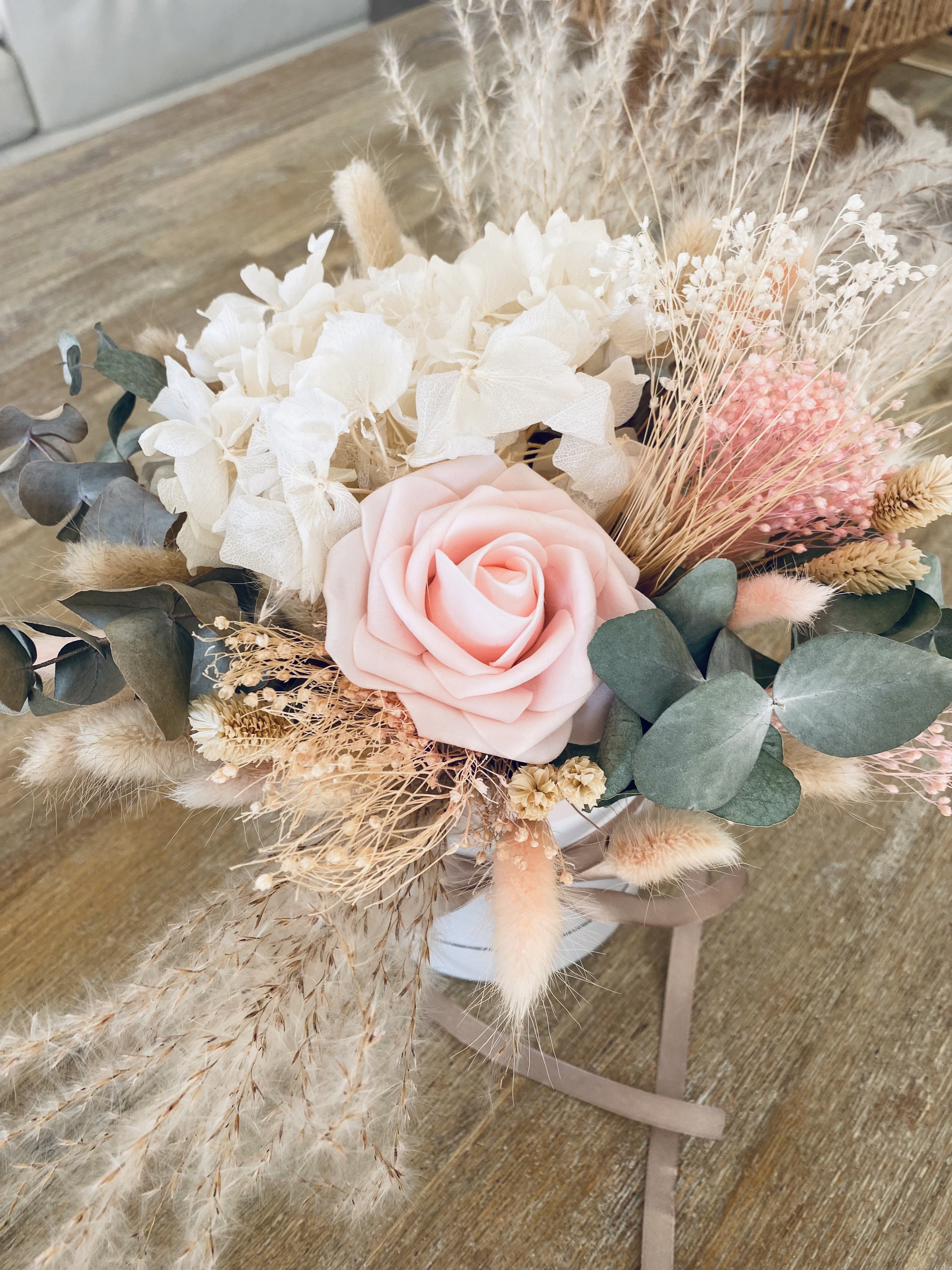 Retour en images sur des créations en fleurs séchées réalisées pour un mariage à St Raphael dans les tons naturels et rose clair. Bouquet de mariée, bouquets de bancs pour l’église et centres de table…